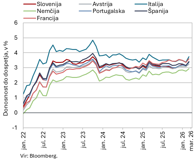 Donosnost do dospetja slovenske državne obveznice se je v prvem četrtletju povišala za 20 b. t., na 3,25 %. Donosnosti so bile višje tudi v drugih državah evrskega območja. Rast je bila najizrazitejša marca, kot odziv na vojno na Bližnjem vzhodu in s tem povezane večje inflacijske pritiske. Razmik do nemške obveznice se je povišal za 6 b. t., na 39 b. t.