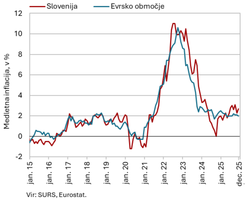 Cene življenjskih potrebščin so decembra tretji mesec zapored ostale nespremenjene, medletna rast pa se je povišala za 0,4 o. t. na 2,7 %. K povečanju inflacije so pomembno prispevale manj izrazite sezonske pocenitve. Na mesečni ravni so se pocenile počitnice v paketu (– 3,1 %) ter obleka in obutev (–0,8 %), pri obeh pa je bilo znižanje cen za približno polovico manjše kot decembra 2024. Opazneje so se na mesečni ravni podražila zavarovanja (za 4,5 %). K medletni inflaciji sicer še vedno največ (0,8 o. t.) prispevajo za 4,5 % višje cene hrane in brezalkoholnih pijač, a se njihova rast v zadnjih mesecih postopoma umirja. Cene so se v tej skupini od oktobra lani do decembra znižale za 0,9 %. Med vsemi 12 skupinami je bila decembra najvišja medletna rast cen v skupini zdravstvo (5,9 %), njihov prispevek k inflaciji pa je, zaradi razmeroma skromnega deleža (okoli 5 % CPI), znašal 0,3 o. t. Medletna rast cen storitev se je ob manj izraziti sezonski pocenitvi počitnic v paketu in podražitvi zavarovanj decembra okrepila za skoraj eno odstotno točko, na 3,6 %. Cene energentov so bile leta 2025 kljub nižjim cenam naftnih derivatov za 1,9 % višje kot leto prej, k rasti pa so prispevale predvsem za 9 % višje cene električne energije in za skoraj 15 % višje cene trdnih goriv.