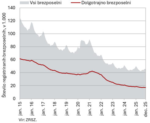 Število brezposelnih je decembra 2025 (ob izločitvi sezonskih vplivov) ostalo podobno kot mesec prej (–0,1 %). Po originalnih podatkih je bilo konec decembra brezposelnih 47.177 oseb oz. 3 % več kot konec novembra, kar je večinoma odraz sezonskih gibanj, povezanih z večjim prilivom v brezposelnost zaradi izteka zaposlitev za določen čas. Medletno je bilo število brezposelnih malenkost višje (0,3 %). Medletni upad dolgotrajno brezposelnih (–5,6 %) in upad brezposelnih, starejših od 50 let (–5,3 %), sta bila nekoliko nižja kot prejšnje mesece. Število brezposelnih mladih (15–29 let) je od konca leta 2024 medletno višje (decembra jih je bilo 10.944, kar je 9,4-odstotno medletno povečanje).