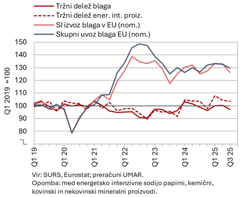 Slovenski izvozni tržni delež na trgu EU se je v tretjem četrtletju 2025 medletno zmanjšal. Medletna rast nominalne evrske vrednosti slovenskega izvoza blaga je v vseh prvih treh četrtletjih leta 2025 zaostajala za rastjo blagovnega uvoza EU. Slovenski izvozni tržni delež na trgu EU je bil tako v tretjem četrtletju medletno manjši za 1,8 %, v prvih treh četrtletjih skupaj pa za 2,1 %. K medletnemu upadu je prispevala večina večjih skupin izdelkov predelovalnih dejavnosti (cestna vozila, električni stroji in naprave, industrijski stroji ter farmacevtski izdelki), tržni delež energetsko intenzivnih proizvodov pa je ostal podoben kot pred letom. Med večjimi trgovinskimi partnericami je bil v treh četrtletjih 2025 tržni delež manjši kot pred letom v Nemčiji, Italiji, Franciji in na Hrvaškem, večji pa le v Avstriji. K medletnemu upadu je prispevalo predvsem zmanjšanje konkurenčnosti na trgu EU (npr. stroškovni pritiski, gl. tudi Slika 4, upad izvoza osebnih vozil zaradi opuščanja proizvodnje modela vozila pri največjem slovenskem proizvajalcu vozil), saj se struktura slovenskega izvoza v EU ni bistveno razlikovala od strukture povpraševanja v EU.