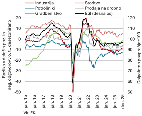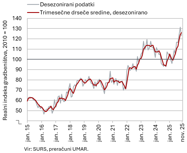 Slovenski izvoz blaga je bil v enajstih mesecih leta 2025 nekoliko manjši kot leto prej, aktivnost v gradbeništvu in potrošnja gospodinjstev pa sta se v desetih mesecih povečali. Realni izvoz blaga se je novembra tekoče povečal drugi mesec zapored, uvoz pa zmanjšal. V enajstih mesecih leta 2025 je bil izvoz blaga za 0,2 % manjši kot v enakem obdobju leto prej, uvoz pa večji za 1,6 %. Na upad izvoza je vplival predvsem manjši izvoz vozil ter drugih strojev in naprav, pa tudi železa in jekla ter nekaterih drugih materialov (izdelki iz kavčuka, mineralni proizvodi, papir). Proizvodnja predelovalnih dejavnosti se je novembra tekoče nekoliko okrepila. V enajstih mesecih je ostala medletno manjša; med večjimi dejavnostmi je bil medletni upad največji v proizvodnji vozil in plovil ter kovinski industriji. Rast vrednosti opravljenih gradbenih del se je po upadu v prvem četrtletju lani od drugega četrtletja močno okrepila, v desetih mesecih je bila medletno večja za desetino. Realni prihodek v večini trgovinskih panog se je po zmanjšanju v tretjem četrtletju oktobra povečal, prodaja v vseh trgovinskih panogah je bila v desetih mesecih lani medletno večja. Realni prihodek tržnih storitev se je po močni rasti v tretjem četrtletju oktobra močno zmanjšal, v desetih mesecih pa je bil medletno manjši le v drugih poslovnih dejavnostih.