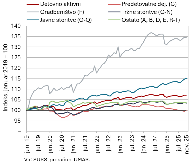 Število delovno aktivnih oseb je novembra ostalo podobno kot prejšnje mesece (desez.), medletno je bilo manjše za 0,4 %. Število zaposlenih je bilo medletno manjše (–0,6 %), število samozaposlenih pa večje (1,3 %). Največji medletni upad števila delovno aktivnih je bil v drugih raznovrstnih poslovnih dejavnostih (–2,1 %), predvsem zaradi zmanjšanja v zaposlovalnih agencijah, sledijo predelovalne dejavnosti (– 1,8 %) ter informacijske in komunikacijske dejavnosti (– 1,3 %). Število delovno aktivnih je bilo medletno še naprej večje v dejavnostih javnih storitev, kjer izstopa predvsem zdravstvo in socialno varstvo (3,4 %). Število delovno aktivnih tujih državljanov je bilo novembra medletno večje za 1,5 %, državljanov Slovenije pa manjše za 0,7 %.