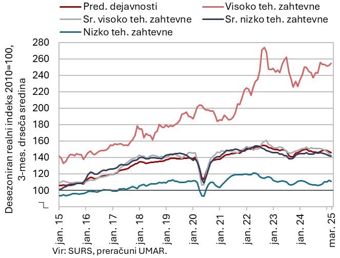 Proizvodnja predelovalnih dejavnosti se je, po rasti v zadnjem lanskem, v letošnjem prvem četrtletju skrčila (desez.), medletno je bila manjša za 2,3 % (del. dnem prilagojeno). V primerjavi z zadnjim četrtletjem lani se je nadalje povečala proizvodnja v visoko in nizko tehnološko zahtevnih panogah, a je bila rast skromna. V srednje tehnološko zahtevnih, ki v veliki meri proizvajajo proizvode za vmesno porabo za tuje trge, se je proizvodnja nadalje skrčila (desez.). Medletno je bila manjša v proizvodnji kovinskih izdelkov (po rasti v lanskem letu), proizvodnji drugih strojev in naprav ter proizvodnji vozil in plovil (C29–C30). V energetsko intenzivnih panogah je bila medletna rast skromna, nižja je bila v nizko tehnološki papirni industriji. Tudi v večini ostalih nizko tehnološko zahtevnih panog je bila proizvodnja nižja kot pred letom (višja je bila le v lesni in nekoliko v prehrambeni ter pohištveni industriji, drugih raznovrstnih pred. dejavnostih). K medletni rasti v visoko tehnološko zahtevnih panogah pa je po naši oceni prispevala predvsem farmacevtska industrija.