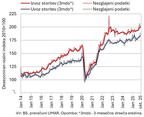 Oktobra se je izvoz blaga nadalje zmanjšal in ostaja medletno nižji. V predelovalnih dejavnostih se je v zadnjih mesecih povečala proizvodnja v visoko in srednje nizko tehnološko zahtevnih panogah, medletno pa skupna proizvodnja ostaja nižja kot pred letom. Obeti v predelovalnih dejavnostih glede pričakovane proizvodnje so se oktobra sicer nadalje izboljšali, a so naročila ostala na nizki ravni. Od drugega četrtletja se močno krepi rast v gradbeništvu. V desetih mesecih so bile večje vrednosti vseh vrst gradbenih del, zlasti v gradnji nestanovanjskih stavb in specializiranih gradbenih delih, rast je bila višja tudi v gradnji inženirskih objektov, v gradnji stanovanjskih stavb pa je ostala skromna. Krepi se tudi prihodek v tržnih storitvah. Kazalnik gospodarske klime v Sloveniji se od sredine leta izboljšuje v v večini dejavnosti, izjema so storitve. Število delovno aktivnih oseb že nekaj mesecev stagnira, število brezposelnih pa se je po rasti v zadnjih mesecih novembra nekoliko zmanjšalo (oboje desez.). Skupna rast bruto plače se je septembra nekoliko okrepila ob višji rasti v javnem sektorju, kar je bila v veliki meri posledica rasti plač v izobraževanju, po naši oceni povezane z izplačili dodatka za učno in pedagoško obveznost. Tudi v zasebnem sektorju je rast ob pomanjkanju delovne sile ostala razmeroma visoka. Medletna rast cen življenjskih potrebščin (2,3 %) je bila novembra najnižja po juniju letos. K inflaciji so še naprej največ prispevale cene hrane in brezalkoholnih pijač, vendar se je njihova rast upočasnila.